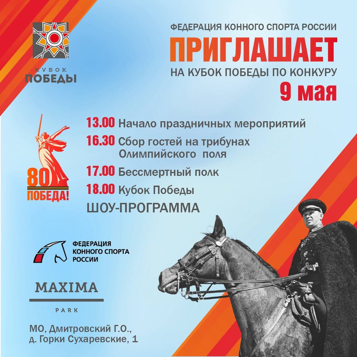 🏆Приглашаем на Кубок Победы – самый патриотичный турнир страны! 9 мая, в день празднования 80-летней годовщины Великой Победы, на площадке Maxima Park состоится юбилейный маршрут Финала Кубка Победы по конкуру-2025. Гостям турнира также будет представлена патриотическая шоу-программа и шествие Бессмертного полка. Кубок Победы – яркий многоэтапный турнир, финал которого проводится в мае на крупнейшей профильной площадке страны – в конноспортивном комплексе MaximaPark под эгидой Федерации конного спорта России. Уже традиционно, этот турнир становится первым в череде стартов на открытых площадках, и позволяет объединить представителей различных регионов страны. На протяжении всего дня гостей комплекса ждут праздничные активности, интересные маршруты и Федерация конного спорта приглашает зрителей на трибуны Maxima Park! Ждём вас завтра! @ФКСР