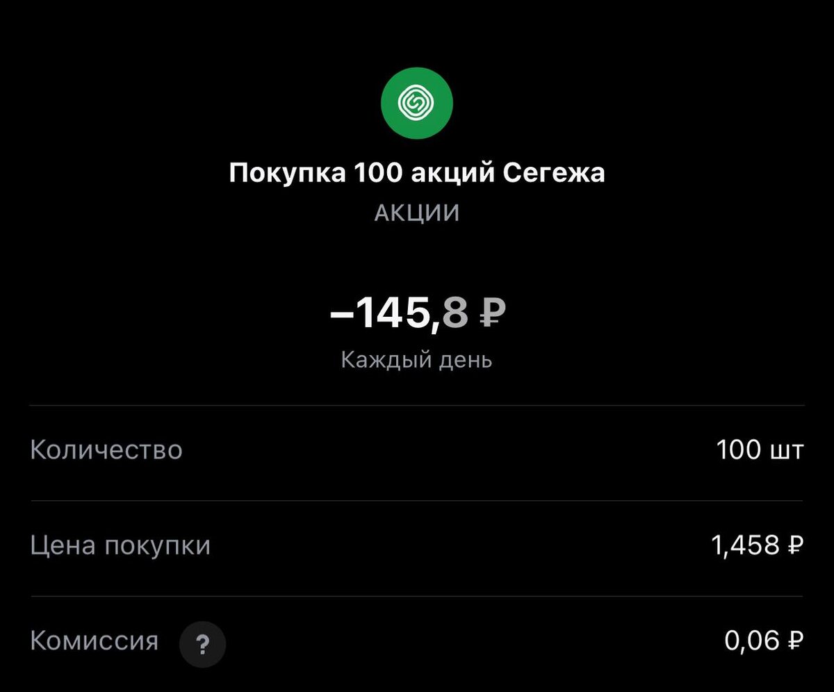 Всем привет! Покупка на сегодня #180 Статистика портфеля на стороннем сервисе, можно посмотреть по "ссылке" Напомню это челендж с коллегами, каждый рабочий день пополняем брокерский счет на 250 рублей и инвестируем. Если возникли вопросы или есть не понимание, что делать. Задавайте «тут» Покупка #180 🟢 "Сегежа" 1.458 rub #SGZH 1 лот #каждыйсможет #челенджсколлегами ✈️ Стас Мироненко 📹Youtube | 📹Rutube