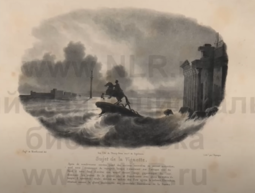 Этот источник хранится в электронной библиотеке НЛР — альбом, посвящённый строительству Исаакиевского собора. Однако одно из изображений явно показывает разрушенный, затопленный город, в центре которого возвышается Медный всадник, Александрийская колонна и Исаакий, частично разрушенный.