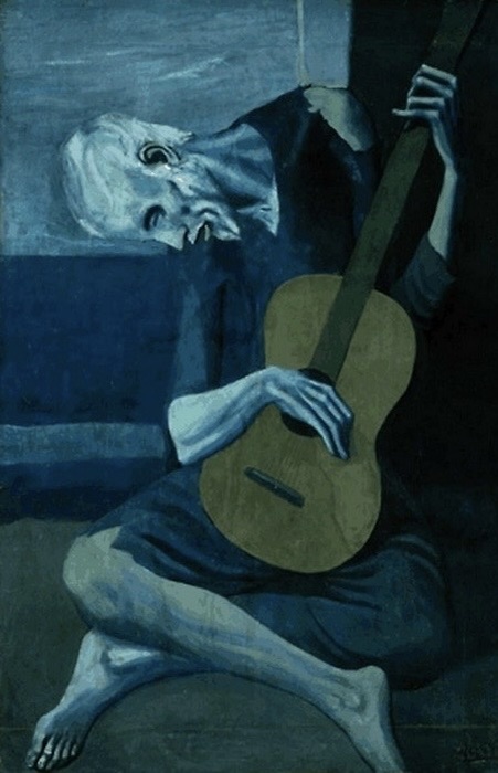 Знакомьтесь художником: Пабло Пикассо «старый гитарист». У молодого Пикассо в пору написания картины редко водились деньги, и потому работы "Голубого периода" художника являются кропотливым и тщательным исследованием низов человеческого общества к которым, безусловно, принадлежал и слепой гитарист, развлекавший публику игрой на гитаре на улицах Старого города Барселоны в попытке заработать себе на кусок хлеба. «Старый гитарист», вероятно, является самой знаковой картиной "Голубого периода" Пикассо. При первом взгляде на эту работу создается впечатление, что слепой музыкант запечатлен в тот момент, когда он тихо испустил дух, не успев доиграть песню до конца. Он похож на привидение, почти сливающееся с фоном, его неестественно согнутая фигура надломлена то ли агонией смерти, то ли агонией тоски. Сумрачная цветовая гамма только усиливает этот эффект. Живой на этом полотне кажется только гитара. Картина написана поверх другого изображения нарисованного на этом же холсте художником прежде