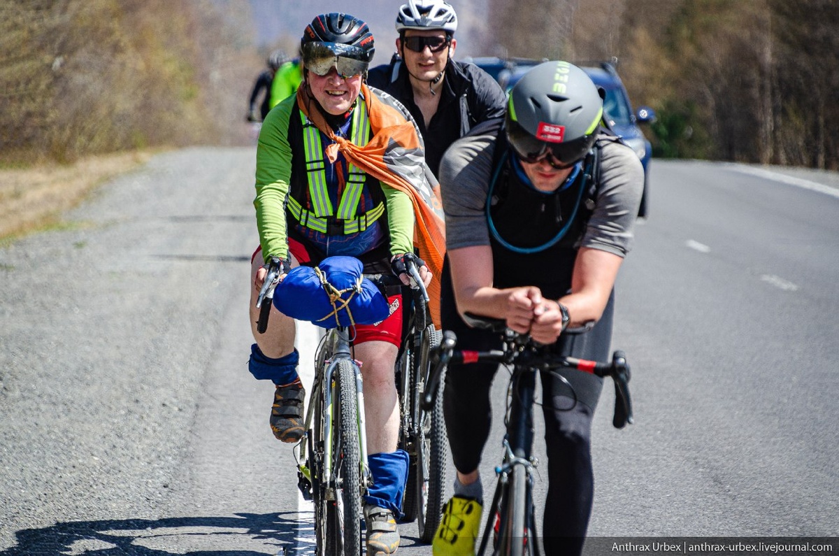 Организаторы Велоаршана сразу предупредили, что для успешного прохождения дистанции нужно накатать в апреле 300 км, в том числе 100 - за одну поездку. Но поскольку в апреле я летал в Таиланд, потом бегал Козерог, потом ходил на Мунку Сардык, накатать мне удалось только 100 км. Старт был в Култуке 8 мая в 12:30, поэтому у меня был отличный план, надежный, как швейцарские часы. Я сложил велосипед в машину, взял жену и выехал в 10:30. Кто бы мог подумать, что в первый выходной, в отличную погоду кто-то еще решится поехать из города. Так что в 11:00 мы еще стояли в пробке на Синюшке. В общем я честно старался не нарушать правил, в 12:20 мы были на повороте в Ангасолку. Но тут все движение встало. Намертво. Немного подождав и собрал свои вещички, достал велосипед и поехал своим ходом, благо с горки. На серпантине разложилась фура, пятеро мужиков пытались перевернуть что-то похожее на фит.. Дальше был перекрыт переезд. "Никогда еще стихия не вставала на пути Остапа Бендера". Короче на общ