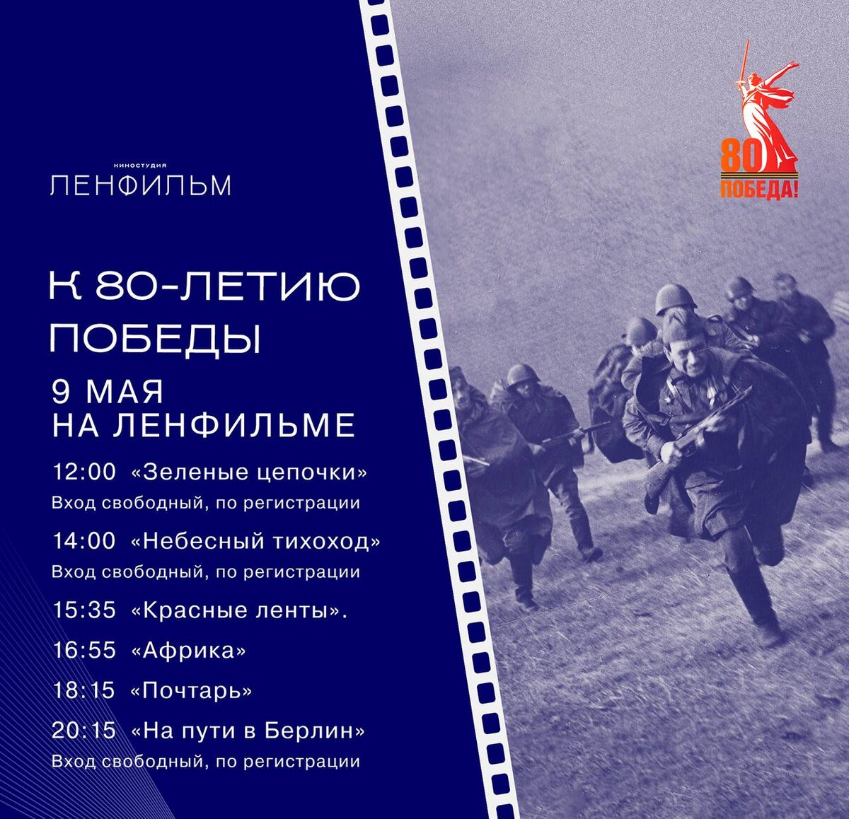 9 мая в кинотеатре «Ленфильма»! 🤍 К 80-летию Победы в рамках «Ленфильм-клуба» показываем фильмы из коллекции нашей киностудии и новинки российского проката о Великой Отечественной войне: 🍿12:00 – «Зеленые цепочки». Вход свободный, по регистрации; 🍿14:00 – «Небесный тихоход». Вход свободный, по регистрации; 🍿15:35 – «Красные ленты». Билеты; 🍿16:55 – «Африка». Билеты; 🍿18:15 – «Почтарь». Билеты; 🍿20:15 – «На пути в Берлин». Вход свободный, по регистрации. #ЛенфильмРекомендует