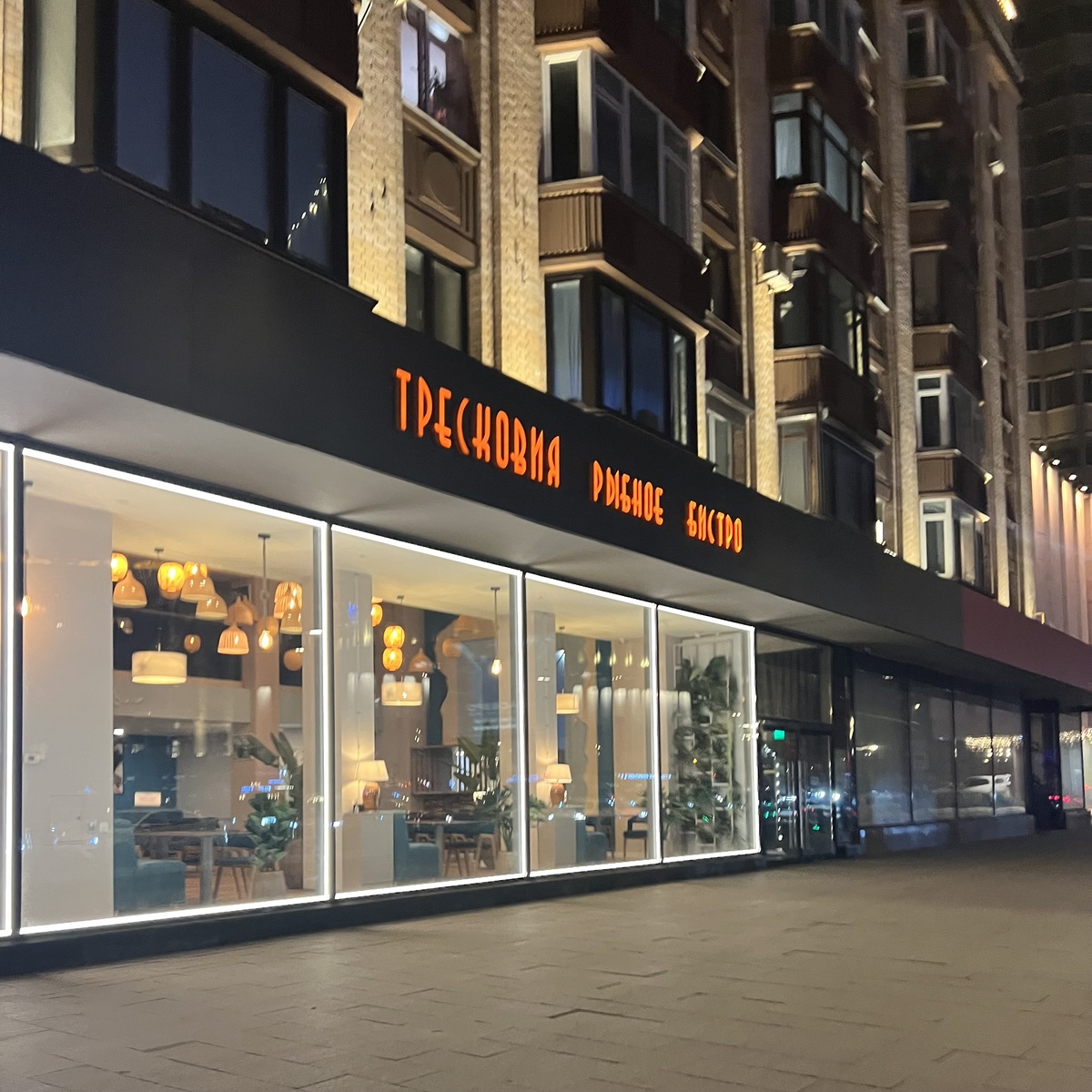Многострадальная и многоунылая нечетная сторона Смоленской улицы, от Садового до «Золотого кольца» (гостиница управделами президента). Если через площадь, за памятником Е.М. Примакову, суета, вереница дорогих авто, народ, туристы и популярные заведения, включая «Сахалин», «#СибирьСибирь», «KU:», а также менее притягательные «Хлеб насущный», Relict, Dolce Far Niente и Bruxelles Pub, то тут тишина и пустота. И тем не менее, в этой самой пустоте с завидным упорством первопроходца кто-то периодически открывает точки общепита. Последним таким участником столичной ресторанной жизни стало рыбное бистро «Тресковия», причем до этого проекта в том же самом помещении уже прогорели Asiatico и Smolenkа Café, а рядом пару лет назад еще загнулся Meat Style. Хотя в последнее время названия заведений все чаще «удивляют», здесь оно еще читается и запоминается с трудом: в голове сидит то «Трескавия», то «Трескария», то «Тресковая». С улицы на прохожих смотрят большие витринные окна без штор и защиты от голодных взглядов. Над окнами черно-оранжевая вывеска.