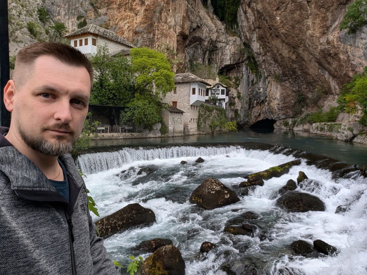 Балгай. Босния и Герцеговина. 25.04.2025 Рассказывает Саша: "Первым делом заскочил в городок Балгай. Он находится минутах в 15-20 от Мостара. Там, по сути, интересовал только один пункт Vrelo Bune, к нему и направился. Там река выходит из скалы и попадает на небольшие перевалы. Если на карту посмотреть, то полноценная река возникает из ниоткуда. Из той чёрной пещеры внизу вся вода и берётся. Приехал рано утром, никого не было, ларьки с сувенирами, рестораны, кафе закрыты. Никто не мешает. " Город Балгай, с населением 2000 человек, знаменит своей рекой Буны, которая берёт начало в ущелье и со скоростью 39 000 литров в секунду чистейшей лазурной воды, вырывается на поверхность. А далее из тихой спокойной глади, через несколько метров увеличивает скорость, падает с естественного обрыва, который образовался во время землетрясения, далее набирает мощь и шумит на перекатах, превращаясь в мощную реку Буны, которая тянется на 9 км.