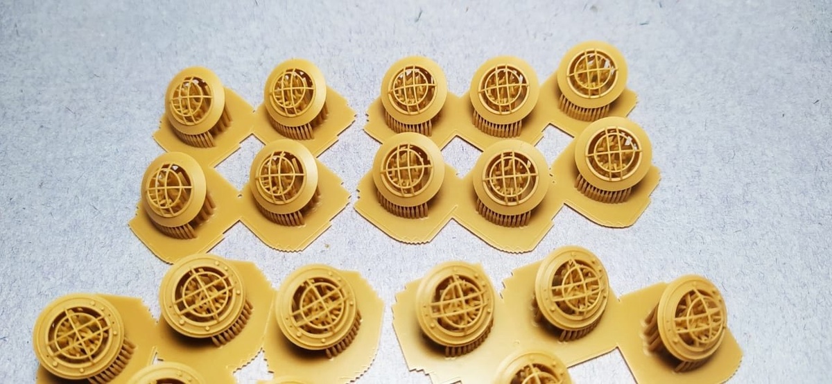 Новосибирская "Рюрик" выпустила на 3D-принтере решетки вместе с верхними частями дымовых труб для моделей ЭБР "Бородино" и "Цесаревич" в масштабе 1/350.