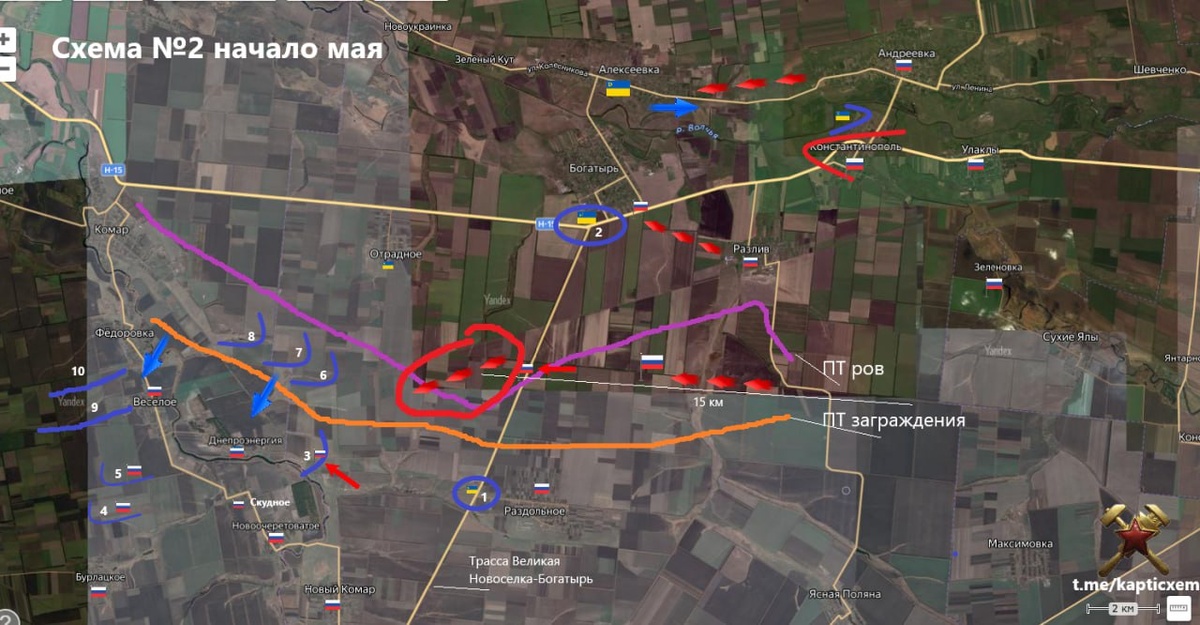 В ответ на пост Западнее Курахово. Богатырское направление (изменения) ВС РФ завершают охват "Большого укрепа №1" - появилась геопривязка - красный овал, вчерашнее продвижение. Приятное начало трехдневного перемирия. схемы и карты