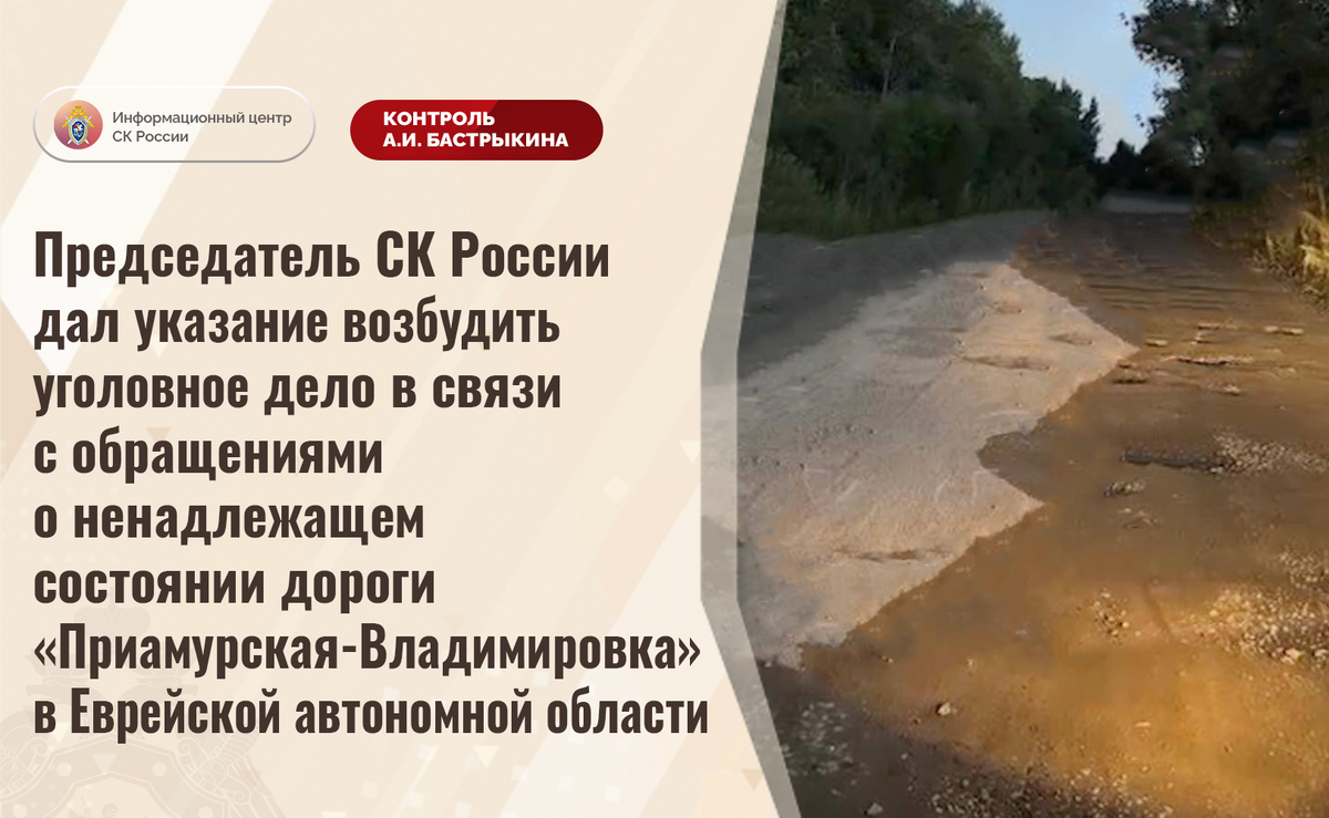 Председатель СК России дал указание возбудить уголовное дело в связи с обращениями о ненадлежащем состоянии дороги «Приамурская-Владимировка» в Еврейской автономной области В комментариях в аккаунте приемной Председателя СК России А.И. Бастрыкина «ВКонтакте» размещены обращения по вопросу несогласия с результатами установления обстоятельств организации ремонтных работ дороги местного значения «Приамурская-Владимировка». Неасфальтированное полотно, покрытое многочисленными колеями и ямами, в период межсезонья размывает, из-за чего проезд личных автомобилей и спецтранспорта затруднен. Несмотря на то, что в прошлом году суд обязал привести социально значимый объект в нормативное состояние, мер до настоящего времени не принято. Ранее указанная ситуация освещалась в социальной сети. А.И. Бастрыкин поручал представить по ней доклад. В СУ СК России по Хабаровскому краю и Еврейской автономной области проводилась процессуальная проверка. Председатель Следственного комитета Российской Федерации