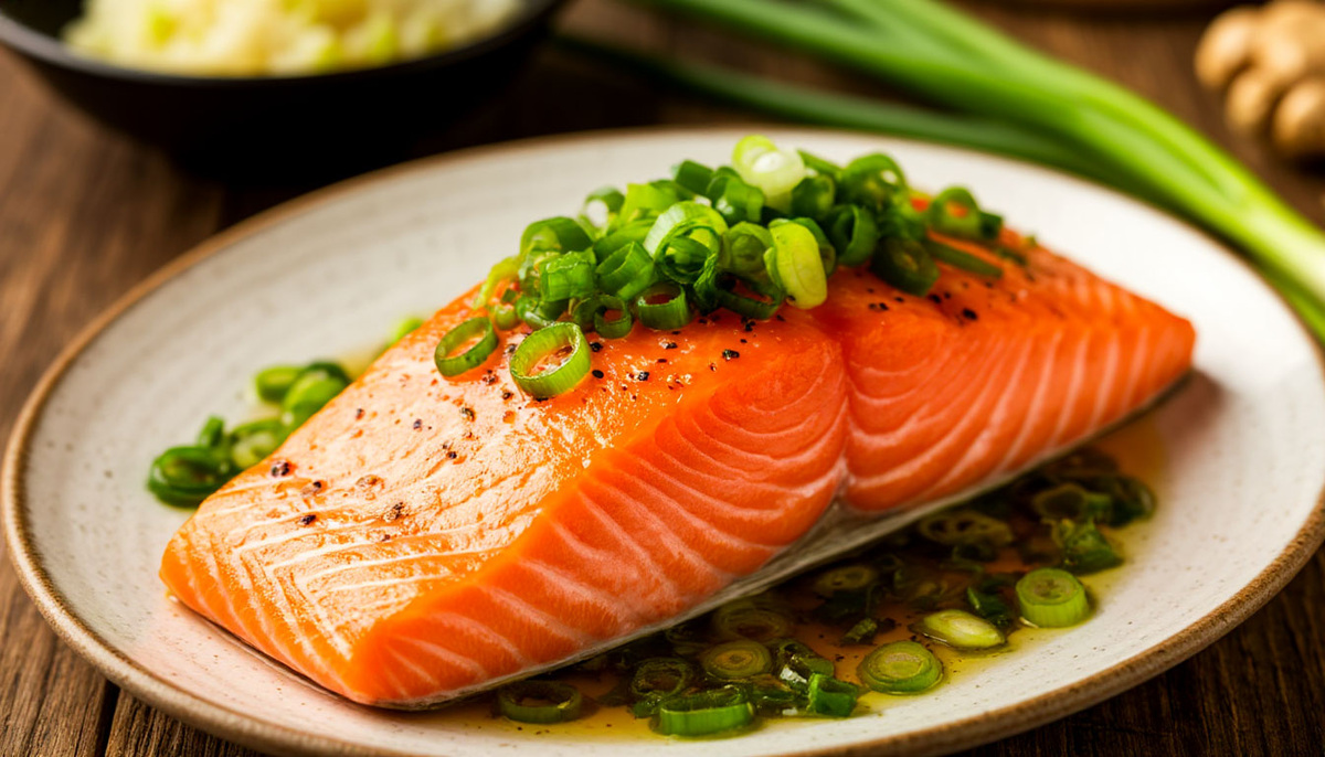 Этот рецепт сочетает нежную текстуру лосося с ярким ароматом зеленого лука и пикантностью имбирного соуса понзу. Блюдо готовится быстро и просто, а результат впечатлит даже самых искушенных гурманов. Ингредиенты (на 2 порции): ⦁ 2 филе лосося (по 150-200 г каждое)
