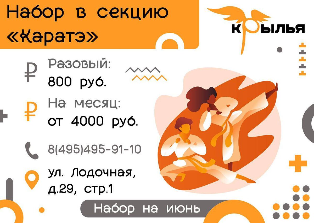 🥋 Набор в секцию «Каратэ»! Хочешь стать сильнее, увереннее и освоить искусство самозащиты? Приглашаем детей от 5 лет в нашу секцию каратэ! 🔥 Что ждёт участников? ✔ Освоение техники ударов и защитных движений ✔ Развитие физической выносливости и силы духа ✔ Дисциплина, уважение и уверенность в своих силах 📅 Расписание занятий: 📍 Адрес: ул. Лодочная, д.29, стр.1 💵 Стоимость: Разовое занятие — 800 ₽ Абонемент на календарный месяц — от 4000 ₽ 📞 Запись по телефону: 📲 8 495 495 91 10 (будни с 10:00 до 18:30) 🥋 Сделай первый шаг к своим вершинам в боевых искусствах вместе с нами!