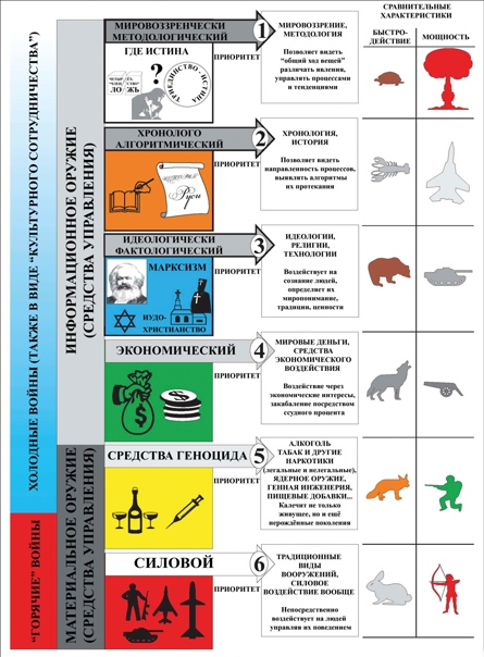 Приоритеты обобщенного оружия применяются концептуальной властью (с глобального надгосударственного уровня) по отношению к концептуально безвластным системам государственного управления, которые не распознают их в качестве реальных управляющих воздействий. Все концептуально значимые преобразования, происходящие в обществе, воспринимаются таким обществом либо как неуправляемая стихия, либо как ошибки системы собственного государственного управления, либо как происки неких врагов, мировых правительств. Эти шесть приоритетов обобщенного оружия (средств управления) в порядке убывания их мощи, но возрастания быстродействия, выглядят следующим образом.