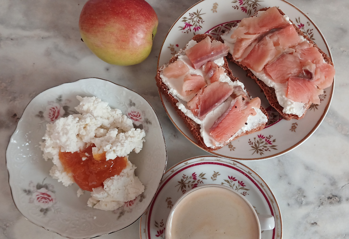 На завтрак собрала то, что было в холодильнике. Был запланирован финский блин, но это будет при других обстоятельствах. Пока все просто и быстро. Доедаем то, что уже приготовлено. Остатки творога с абрикосовым джемом, пара бутербродов с творожным сыром и горбушей, яблоко и кофе На обед борщ и снова бутерброды с горбушей В качестве белка добавила упаковку творога из топленого молока с клубникой, и чашечка кофе с халвой в шоколаде на десерт А к ужину разогрела горшочки: осталось по одному с рисом и с гречкой. Добавила овощей - айсберг и болгарский перец. А потом еще стакан кефира с последней ложкой какао. Какао растворимое закончилось, нужно записать в план покупок. Меню год назад