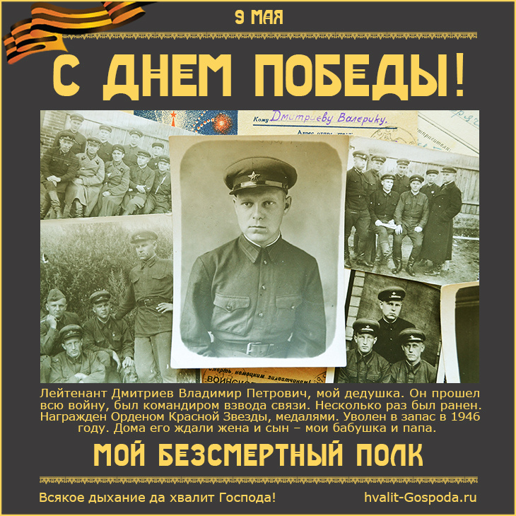 Лейтенант Дмитриев Владимир Петрович, мой дед, прошел всю войну, был командиром взвода связи. Несколько раз был ранен. Награжден Орденом Красной Звезды, медалями. Уволен в запас в 1946 году. Дома его ждали жена и сын – мои бабушка и отец. ХРИСТОС ВОСКРЕСЕ! «Нет больше той любви, аще кто положит душу свою за други своя». Евангелие от Иоанна, глава 15, стих 13. МОЛИТВА О МИРЕ МЕЖДУ РОССИЕЙ И УКРАИНОЙ Жизнодавче Христе! Услышь, нас, недостойных, даруй нам покаяния, умягчения наших ожесточенных сердец и братской любви; защити от дьявольских сил, сеющих вражду между нами и льющих потоки лжи; даруй победы над ними, восстанови мир между Россией и Украиной и воссоедини наши народы. Яви нам и нашим правителям СВОЮ волю и даруй сил и терпения, чтобы ее исполнить. Аминь! Читать на сайте>> С любовью о Господе, Ирина Дмитриева, автор проекта.