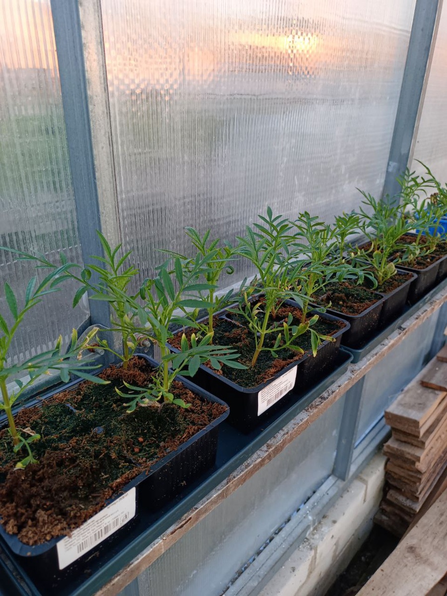 Партия бархатцев, которая после пикировки ушла жить в теплицу