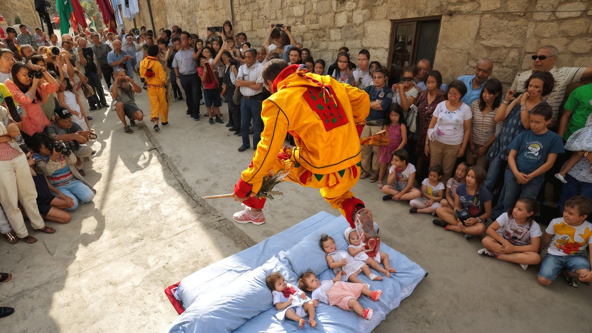 В день праздника центральная улица преображается. На матрасах лежат младенцы. Барабанный бой громче... Толпа расступается...
