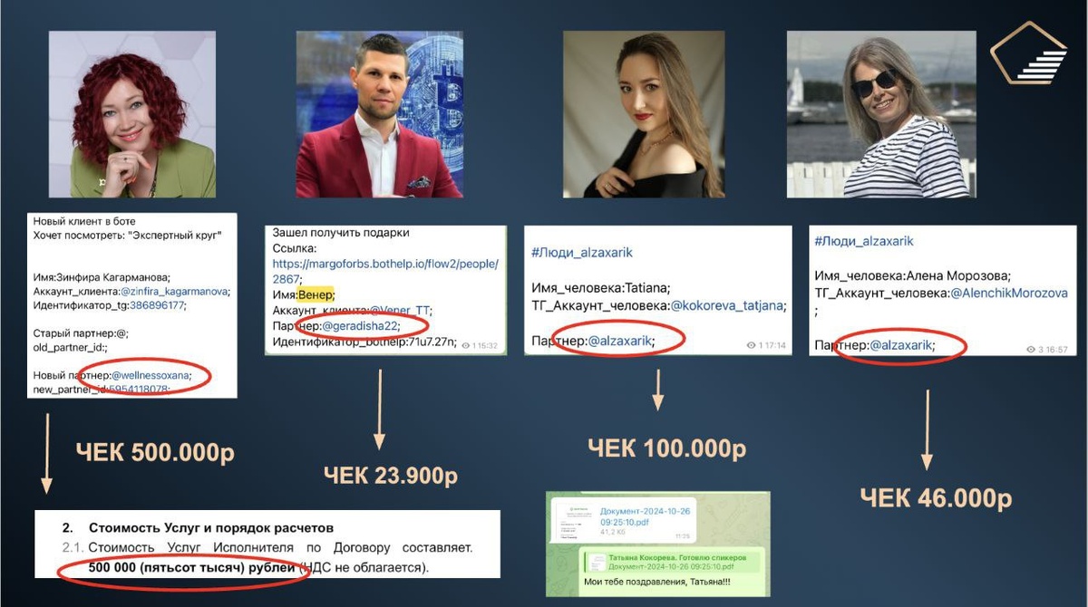Вот реальные примеры: — Зинфира Кагарманова — пришла по рекомендации, чек 500.000₽ за 18 дней — Татьяна Кокорева — чек 100.000₽ — Алена Морозова — 45.000₽ — Венер Асадуллин — 21.000₽ Всё это — через мою систему мотивации в боте, которую ты сможешь внедрить даже без техспецов.