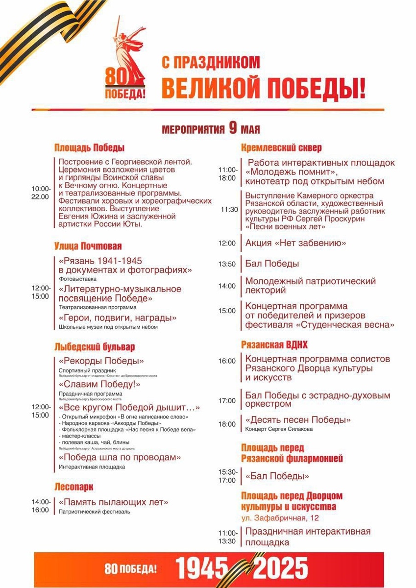 🌟 Как и обещали, рассказываем о других праздничных площадках 9 мая. Напомним, центральной локацией выбрана площадь Победы. О том, что будет там, поделились в предыдущем посте. 🕊 улица Почтовая с 12 до 15 часов фотовыставка, театрализованная программа, школьные музеи под открытым небом 🕊 Лыбедский бульвар с 12 до 15 часов спортивный праздник, открытый микрофон, народное караоке, фольклорная площадка, мастер-классы, полевая каша, чай и блины 🕊 Лесопарк с 14 до 16 часов патриотический фестиваль 🕊 Соборный парк Кремля с 11 до 18 часов площадку организует Комитет по делам молодёжи 🕊 Рязанская ВДНХ с 16 до 18 часов концерты, Бал Победы, мастер-классы #гуляка_мероприятия #гуляка_день_победы ✔️ Подпишитесь на «Рязанского гуляку»