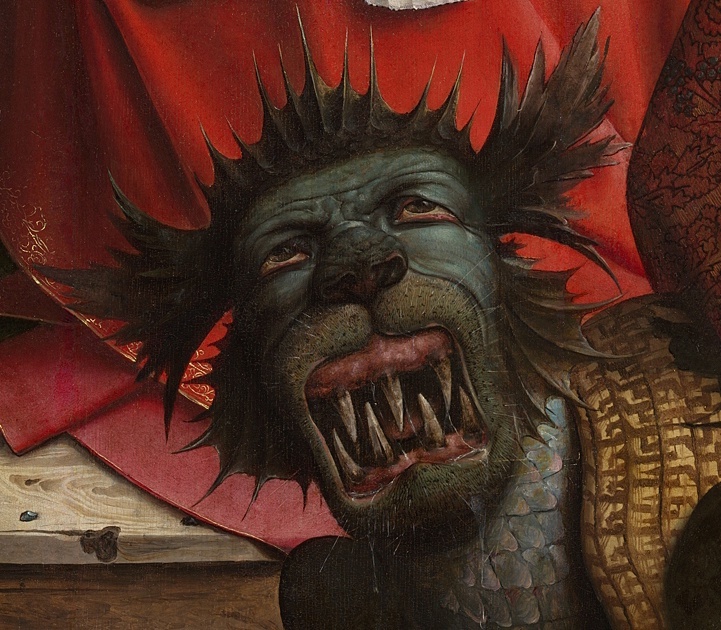 Национальная галерея в Лондоне только что приобрела расписанный алтарь начала XVI века за фантастическую сумму 16,4 миллиона фунтов (это 22 млн долларов). Алтарь действительно крутой, а особенно впечатляет изображенный на нем зубастый дракон с висячими собачьими ушами. Посмотрите, какой красавчик! Произведение названо «Мадонна с младенцем святыми Людовиком и Маргаритой», его автор неизвестен. Картина написана масляными красками, и мы видим деву Марию с младенцем на троне под богато вышитым полотняным балдахином. Вокруг появляются ангелы, один из которых играет на губной гармошке, другой держит псалтырь. Перед ангелами и по бокам находятся двое святых: Святой Людовик (король Франции Людовик IX) и Святая Маргарита, выходящая из тела дракона. Причём тут дракон? Дело в том, что по легенде, Маргариту, не желавшую отречься от христианства, язычники бросили в тюрьму (дело было в самом начале IV века). Там и появился дьявол в образе ужасного дракона, который уговаривал Маргариту впасть во грех