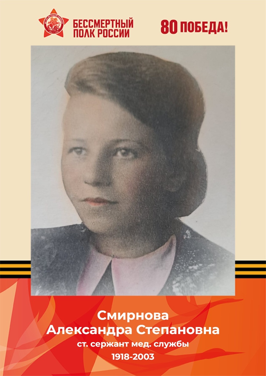 Моя бабушка, мама папы, Александра Степановна Смирнова (Шибаева) ушла на фронт летом 1942 года. До призыва она работала акушеркой в родильном доме в деревне Очаково, что сейчас является частью Западного административного округа города Москвы под названием "Очаково-Матвеевское". Окончив Серпуховское медицинское училище, Александра была распределена на работу в ближайший пригород столицы. Она училась хорошо и старательно. Старшая дочь в семье, на которую постоянно сваливались заботы о младших детях: сестре и двух братьях, дому и огороду. Кто скажет, что был бы этому рад? Родители, погрязшие в ежедневной рутине, отсутствие ласки и внимания: все это подталкивало Шуру прилежно учиться, впитывать любую полезную информацию, чтобы поскорее выломиться из этого жизненного уклада. Ей было дано немало: расторопная, все схватывала на лету, умелые руки, которые в дальнейшем стали ее рабочим инструментом. Александру хвалили за ее акушерское мастерство, за принятие сложных родов, ее руки были именно для этого. Она ими чувствовала, она видела руками, все детки, принятые Шурой, были живыми и здоровыми.