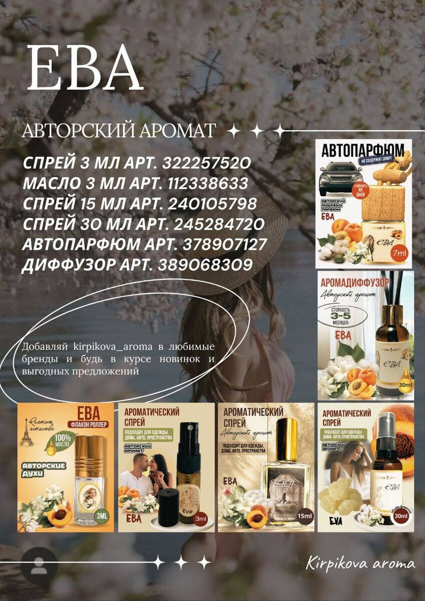Ева Спрей 3 мл Арт. 322257520 Масло 3 мл Арт. 112338633 Спрей 15 мл Арт. 240105798 Спрей 30 мл Арт. 245284720 Автопарфюм Арт. 378907127 Аромадиффузор Арт. 389068309 Обволакивающий, сладковато-воздушный, кремовый. Аромат невинности и чувственности одновременно. В нём много воздуха, на лето просто идеально. В нотах звучит мускус, нежная магнолия, сладкий персик, сливки и хлопок придают аромату сладость и лактонность. https://www.wildberries.ru/brands/311465250-kirpikova-aroma