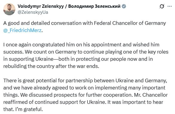 Zelensky speaks with new German Chancellor Merz Says he counts on Germany for weapons AND rebuilding No need to ask, Merz has already promised to give him everything he wants