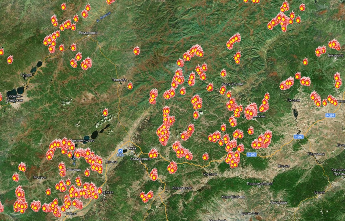 Больше всего очагов действуют в районе пгт Новокручининский, Вершино-Дарасунский, около сел Сохондо и Улеты.