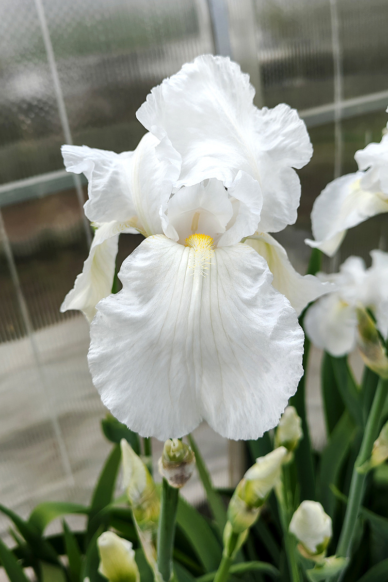 Вот вам какой на ум приходит? Я бы назвала каллы. У мужа оказалось совершенно неожиданное мнение. Не понимаю, говорит, твои ирисы. Какие-то они слишком эротичные. Опачки! А где, а чем? Нет ответа. Такая вот ассоциация. Может, на кружевной пеньюар похожи? Ирисы все достались нам вместе с дачей. Сорта, понятно, уже не узнать. Конкретно эти белые - просто атланты среди остальных. И зелень у них "вам по пояс будет" (с), и цветоносы высоченные. А уж цветы какие - с две ладони! Растут они на полном солнце и распускаются поэтому раньше желтых, которые все утро сидят в тени и пока только раскачиваются на цветение. Иридарий выглядит пышно и необычно. Скоро в эту композицию добавятся роза и пион. Нет, им не тесно, расстояние между кустами выдержано. Просто ракурс такой. Спереди их подбивает портулак садовый, но он только-только просыпается. У таких огромных ирисов есть свой нюанс. Они плохо держат цветоносы. Самые высокие белые не зря посажены в дальний ряд. Они подпирают друг друга. Спереди их