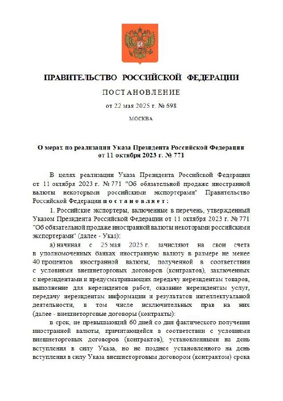 Правительство утвердило постановление об обязательной продаже валютной выручки экспортерами до 30 апреля 2026 года Правительство в рамках реализации указа Президента утвердило постановление о продлении требования об обязательной продаже валютной выручки экспортерами. Принятое решение обеспечит прогнозируемость притока иностранной валюты на внутренний рынок. Как следует из документа, с 25 мая 2025 года экспортеры, включенные в перечень, утвержденный указом Президента, обязаны зачислять на свои счета в уполномоченных банках не менее 40% иностранной валюты, полученной по внешнеторговым контрактам. Также эти компании обязаны продавать на внутреннем рынке не менее 90% валютной выручки, зачисленной на счета в российских банках, но не менее 25% от средств, полученных в соответствии с каждым экспортным контрактом. Постановление не влияет на курс, т.к., фактически, сейчас экспортёры продают около 90% валютной выручки Расходы - в рублях, поэтому приходится продавать валюту Telegram