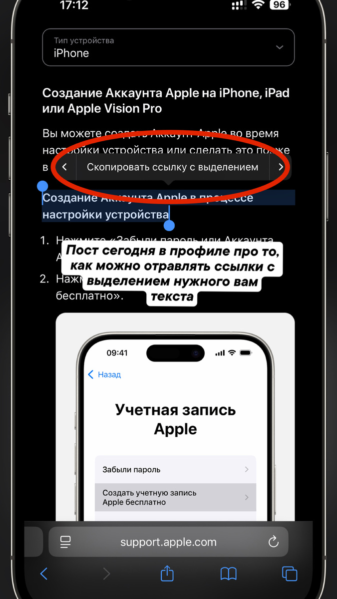 Как отправлять ссылку на статью из интернета сразу С ПОДСВЕЧЕННЫМ МЕСТОМ В ТЕКСТЕ, которое вам нужно выделить и вы бы хотели поделиться именно им? На iPhone или iPad Откройте нужный вам сайт в Safari Найдите и выделите часть текста долгим тапом по нему Во всплывающем меню найдите кнопку «Скопировать ссылку с выделением» Отправьте ссылку — у получателя него она откроется с подсвеченным текстом На macOS Откройте нужный вам сайт в Safari Найдите и выделите часть текста Щелкните на нее правой кнопкой мыши Выберите «Скопировать ссылку на выделенное» Отправьте ссылку