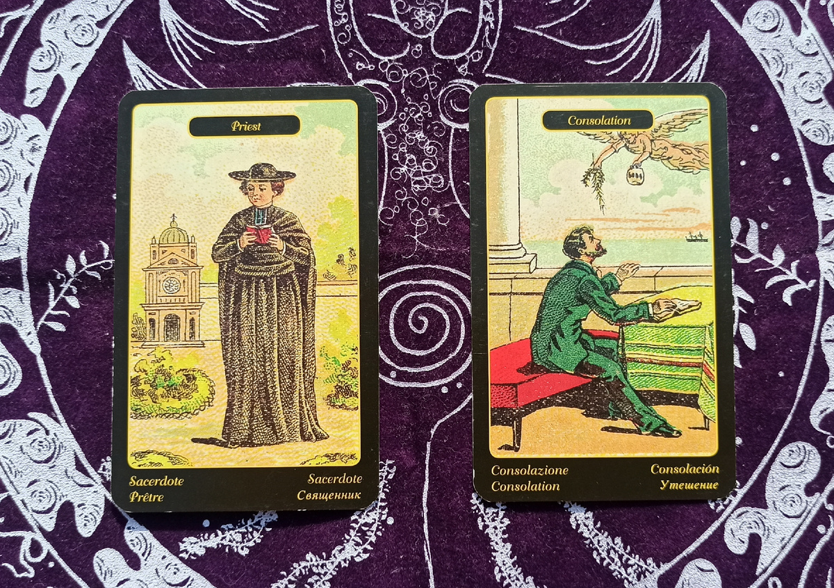 На него выпала карта "Священник" - он очень сильный и мощный человек. Может иметь серьезные связи, иметь признание и авторитет. Человек может быть связан с постоянным решением каких-то проблем и вопросов. Он может быть руководителем или юристом, серьезный, спокойный внушает доверие, он может дать мудрый совет, имеет твердый характер, довольно упрям. С ним есть ощущение безопасности и уверенности, однако, человек может быть довольно холоден и сдержан в проявлении эмоций. Он свободен от ограничений, сам по себе свободолюбив и несентиментаен.