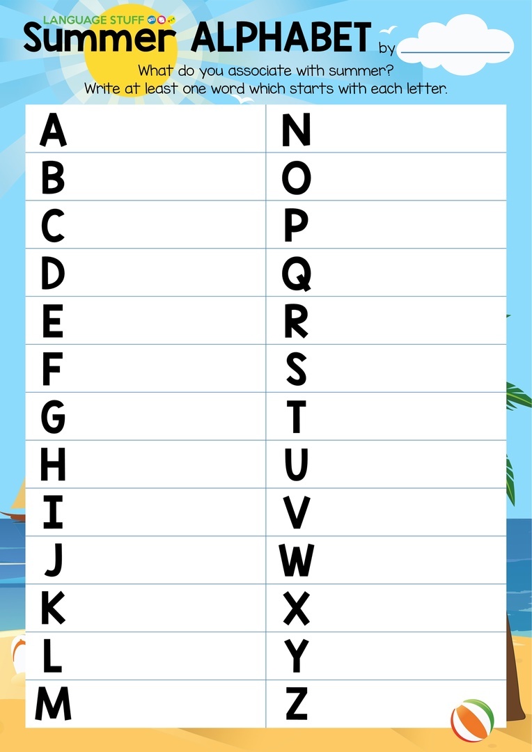 Предлагается на каждую букву алфавита придумать слово, потом объяснить, как оно у тебя ассоциируется с летом (кстати, это можно адаптировать к любому времени года, да и вообще к любой теме).