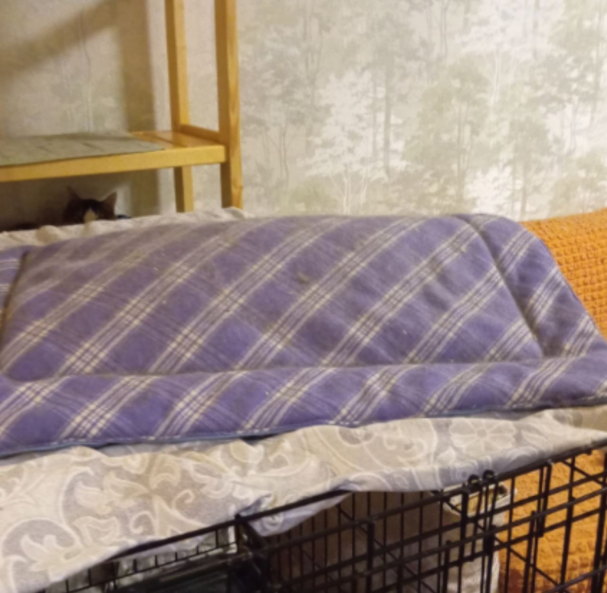Уставшая захожу в комнату, и вижу такую картину - лежанка лежит как то странно. Неестественно, сразу даже не поняла, что это.