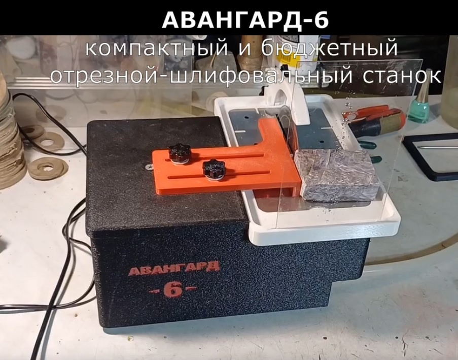 Представляю пилотный вариант компактного станочка АВАНГАРД-6. Видео на странице может долго грузиться. Ссылка на видео: Постараемся сделать серийный вариант максимально бюджетным. Серия выйдет в продажу ориентировочно в июне. Коллекторный двигатель, выходная мощность 250 ватт Управление от ножной педали: включение, выключение, регулировка скорости до 3000 об.мин Отрезной диск до 125 мм (глубина распила до 40 мм) Шлифовальный диск до 125 мм Электробезопасность: двигатель установлен на диэлектрическое шасси и полностью гальванически развязан с рабочим валом, диском. Станок оборудован параллельным упором для распиливания камней на пластины, передним и задним брызгозащитными козырьками. Трубка слива воды из ванночки. Габариты: 270х250х170 мм Вес 2.7 кг. Гарантийный срок эксплуатации 1 год. Серийный вариант поступит в продажу в конце июня. Анонс будет обязательно. Http://stameskino.ru Shop@stameskino.ru