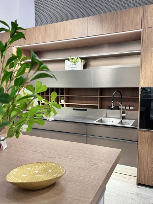 Подъёмный фартук (система MoverFlat), керамика Compact-Laminate, посудомоечная машина в компактном корпусе и максимум продуманного хранения — в этой кухне всё работает на вас.