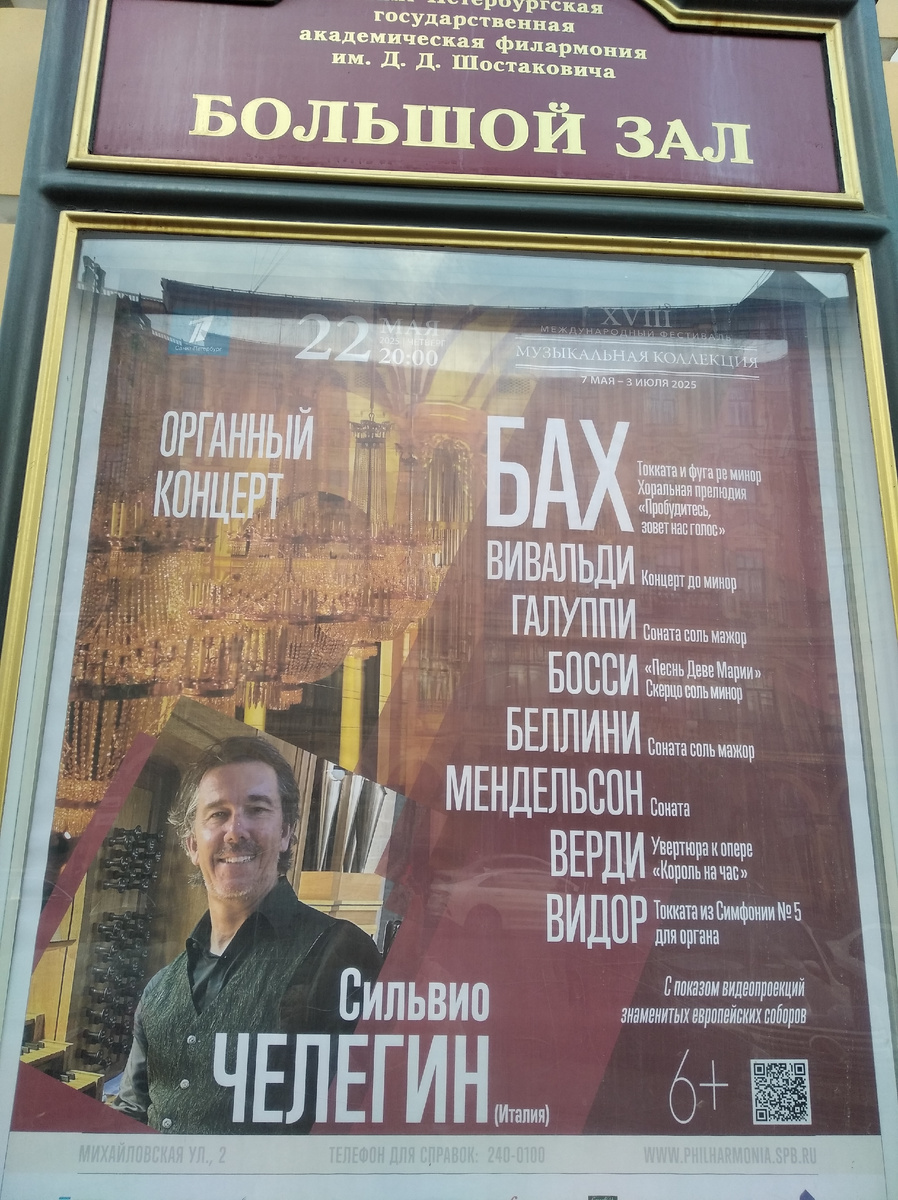 Органный концерт Сильвио Челегина. Проходил в Филармонии, Большой зал. Об истории Филармонии я уже писала, когда ходила на концерт Дениса Мацуева. Продолжаю изучать звучание различных органов и сегодня на повестке дня орган Санкт-Петербургской филармонии им. Д.Д.Шостаковича. Концертный орган, изготовленный фирмой "E.F. Walcker", был привезен в Петербург из Германии лейб-акушером Дмитрием Оттом. Врач, открывший в российской столице императорский клинический повивальный институт, считал, что органная музыка благоприятно влияет на здоровье рожениц. Именно поэтому в 1903 году инструмент был установлен в актовом зале института Отта. Концерты для рожениц проводились каждый день, была установлена система передачи звука из зала в палаты через телефонные трубки. Выступали профессора Консерватории и ведущие органисты города. После революции 1917 года орган перестали использовать и демонтировали. А летом 1931 года его перенесли в Большой зал Филармонии, и 1 октября 1931 года он возобновил сво