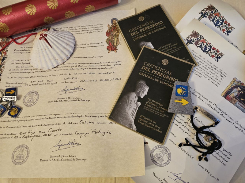 Компостелу, именное свидетельство, и сертификат о прохождении пути супруги получали в разных окошках. У Веры в грамоте обозначены 280 километров, у Николая — 240.
