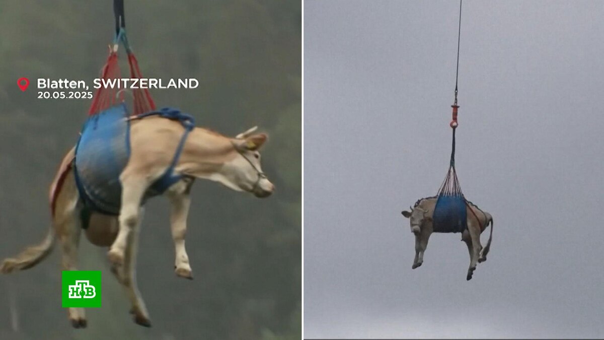 [ Смотреть видео на сайте НТВ ] Необычную спасательную операцию провели на юге Швейцарии. Несколько десятков альпийских буренок были вывезены по воздуху из деревни Блаттен на юге страны. Коров решили эвакуировать после того, как стало известно, что населенному пункту угрожает оползень. В условиях сложного горного рельефа вывезти этих животных в безопасное место по дорогам оказалось невозможно, решили использовать вертолеты. Все коровы успешно перенесли полет и были переданы владельцам. Из населенного пункта также эвакуировали около 300 местных жителей. [ Смотреть видео на сайте НТВ ]