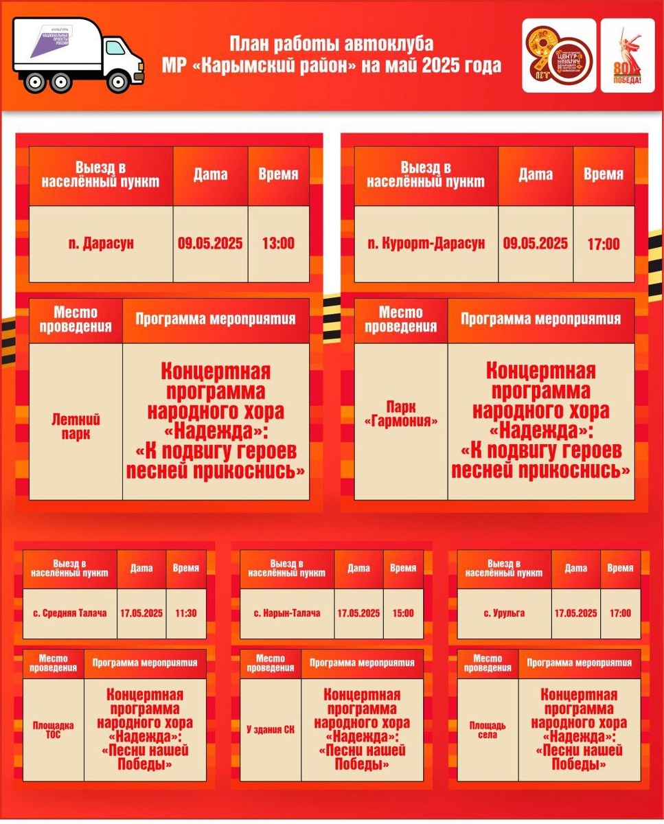🇷🇺 В 2025 году гайд "Дорогами культуры" включит в себя патриотические программы, посвященные празднованию 80-летнего юбилея Победы в Великой Отечественной войне. 🚐 Где побывал в мае автоклуб Карымского района, смотрите афишу 🗺️ Гайд "Дорогами культуры" - это ежемесячная афиша мероприятий, которые проводят передвижные клубные учреждения Забайкалья. Нацпроект «Культура» #реализацияпроектагайддорогамикультуры75 #нацпроекткультура
