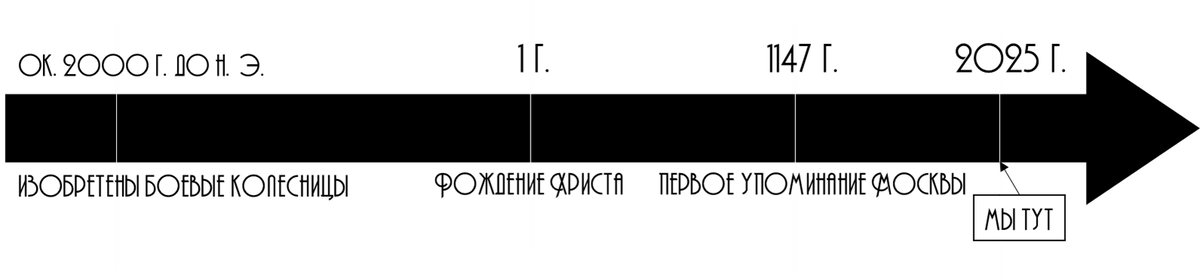История - наука интересная, хоть и не все ей доверяют. И пусть собой она представляет больше результат анализа огромного количества информации, чем сами факты - которые, конечно, относительны, - однако, поговорим о введении в эту славную науку, которое нас ожидает в 5 классе. Начнём с того, что в общепринятых стандартах используется лента времени: наша х-координата, которая не имеет точки "0", но имеет отрицательные значения. Вместо "минуса" мы используем понятие "до нашей эры", также известное как "до Рождества Христова" или просто: "до н. э.". О Рождестве Христовом поговорим в 59 параграфе, а пока запомним: пока атеисты оспаривают существование Иисуса Христоса, на его рождении строится современное летоисчисление. Мы живём в 2025 году нашей эры, но называем просто: 2025 г. А, например, около 2000 г. до н. э. были изобретены боевые колесницы: 2025+2000 = произошло это около 4025 лет назад. Вот такая несложная арифметика. Кстати, такое задание встречается в итоговых тестах за 5 класс!
