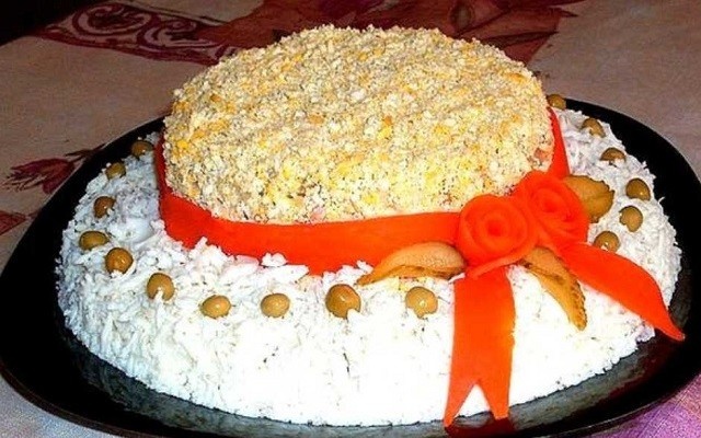 Такое угощение отлично впишется в праздничный стол детского дня рождения или человека, родившегося в год тигра. Проявите фантазию и украсьте любой слоеный салат подручными продуктами.
