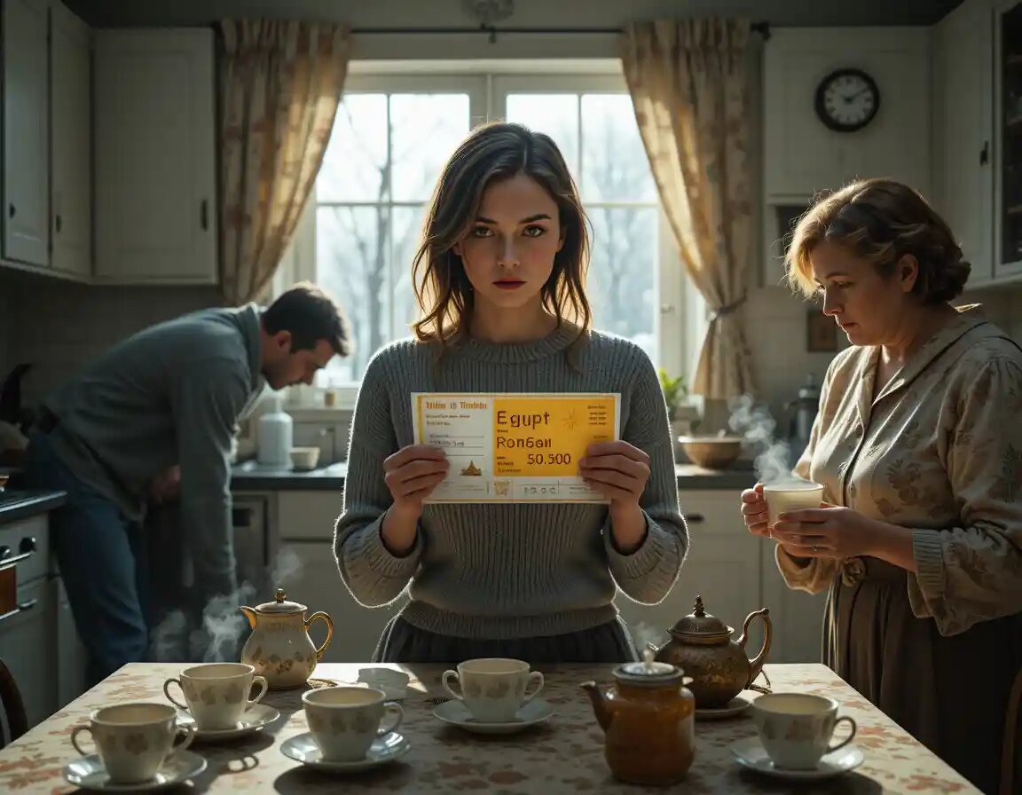 Анна сидела на краешке дивана, словно школьница, ожидающая вызова к доске. На столе лежала яркая путёвка в Египет с золотыми пальмами и надписью "Поздравляем! Вы — победитель!". Улыбка, прилипшая к лицу ещё с пятницы, уже начинала спадать. Настроение портилось. С кухни доносилось деловитое позвякивание ложек — это Елена Сергеевна наливала чай в свои массивные чашки с лебедями. Эти чашки Анна ненавидела всей душой — как символ чего-то нерушимого, глупого и громоздкого.