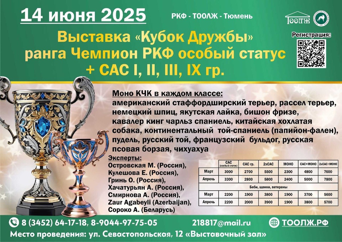 ⏰ 14 июн (24д) 🏛 #Тюмень #Россия #Выставка 🐶 Выставка собак: Кубок Дружбы 🏆 Тюменское областное объединение любителей животных Контакты и вопросы организаторам здесь: 🌐 https://www.petsman.ru/vystavki-sobak.php?mesto=68-tyumen Выставка «Кубок Дружбы» ранга Чемпион РКФ особый статус + CAC I, II, III, IX гр. Моно КЧК в каждом классе: американский стаффордширский терьер йоркширский терьер рассел терьер немецкий шпиц бишон фризе кавалер кинг чарльз спаниель китайская хохлатая собака континентальный той-спаниель (папийон-фален) пудель русский той французский бульдог русская псовая борзая чихуахуа 🧑 👨 Эксперты: 🔹 Островская М. (Россия) 🔹 Кулешова Е. (Россия) 🔹 Гринь О. (Россия) 🔹 Хачатурьян А. (Россия) 🔹 Смирнова А. (Россия) 🔹 Zaur Agabeyli (Azerbaijan) 🔹 Сороко А. (Беларусь)