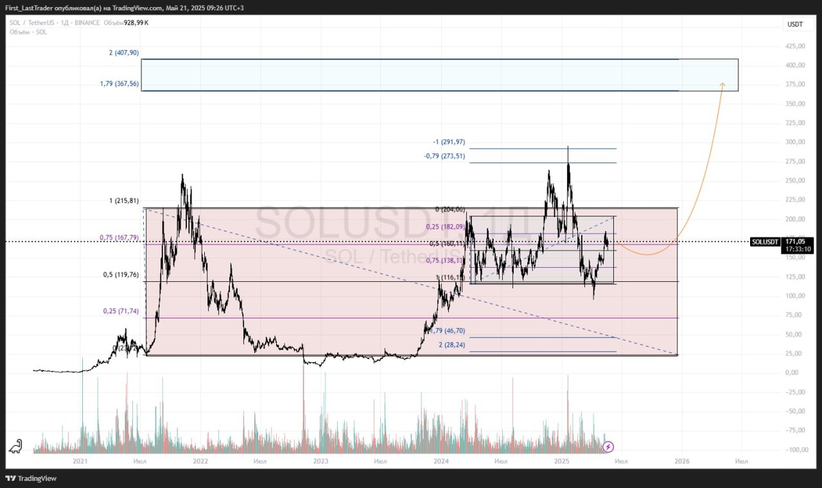 #solusdt Так друзья, решил вам обновить SOL. Немного нашел своих старых графиков на просторах telegram, можете посмотреть: https://www.tradingview.com/x/ONMfUg9p/ https://www.tradingview.com/x/Cf1nxIBz/ А теперь обновленное: https://www.tradingview.com/x/23UaOziy/ - это боковик https://www.tradingview.com/x/BAtyEm1f/ - это ВА (касание 4-ой было прекрасным) 📱 YouTube 🚀 PREMIUM 📈 Bybit
