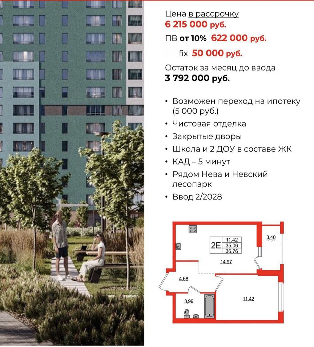 📼622 000 ₽ ПЕРВЫЙ ВЗНОС ЗА СВОЮ ОДНОКОМНАТНУЮ КВАРТИРУ. Однокомнатная квартира с полной отделкой у Невы, с первым взносом всего 622 000 рублей! 😄Пока строится дом, фиксированный платёж составит 50.000 рублей 😄За месяц до сдачи дома, вносите остаток, либо переходите на ипотеку. 😄Стоимость услуги перевода на ипотеку (от застройщика 5 000) ❤️ Срок сдачи середина 2028 года. 🖥 Информацию о жилом комплексе, планировки с ценами и индивидуальный расчёт рассрочки, отправим в личные сообщения, для этого поставьте ➕ в комментариях.