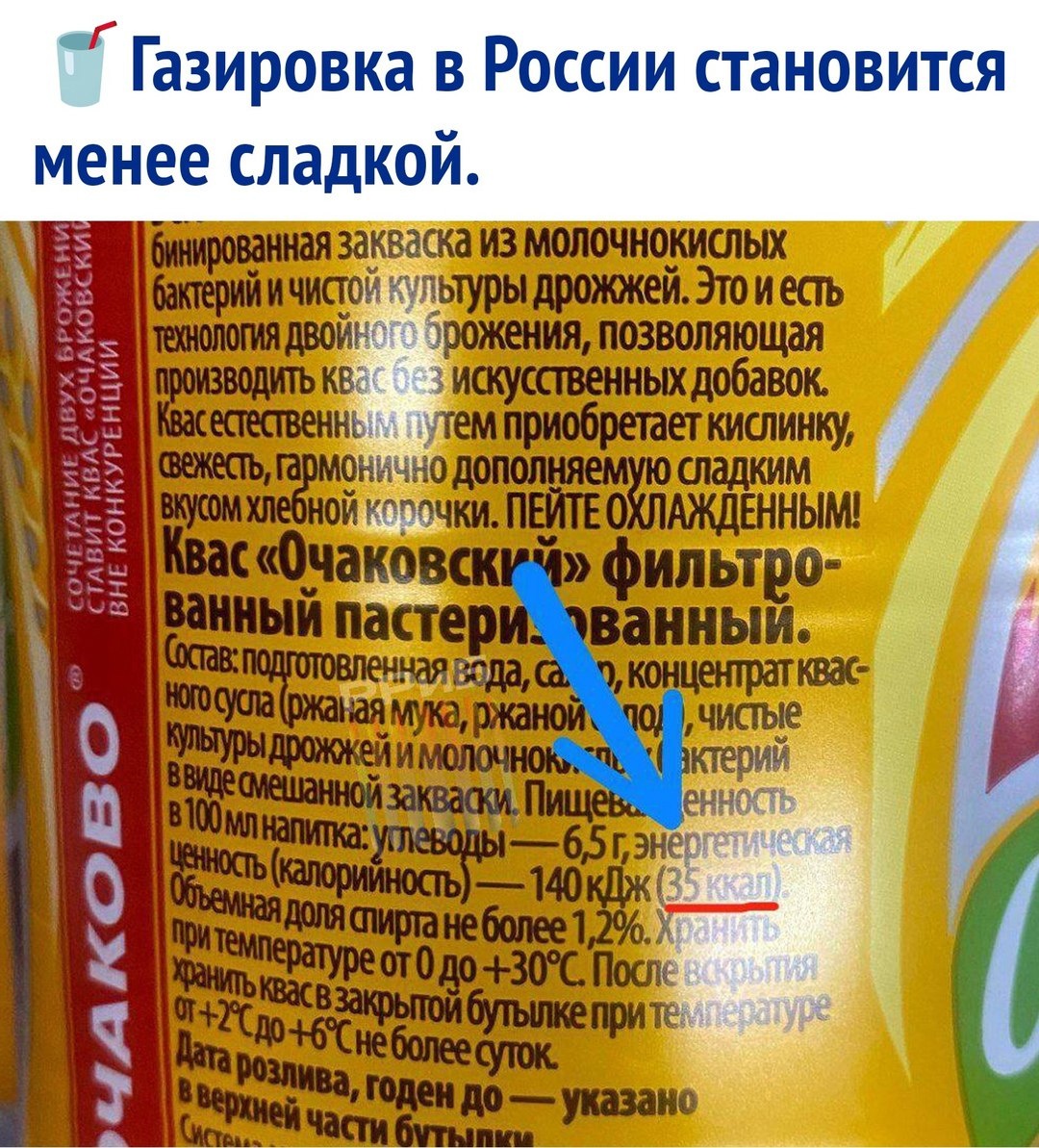 Причина изменений — увеличение акциза с 7 до 10 рублей за литр. К примеру, в результате этого в квасе "Очаковский" калорийность снизилась с 35 до 20 ккал на 100 мл, а в лимонаде "Добрый" — с 32 до 19 ккал. Другие новости
