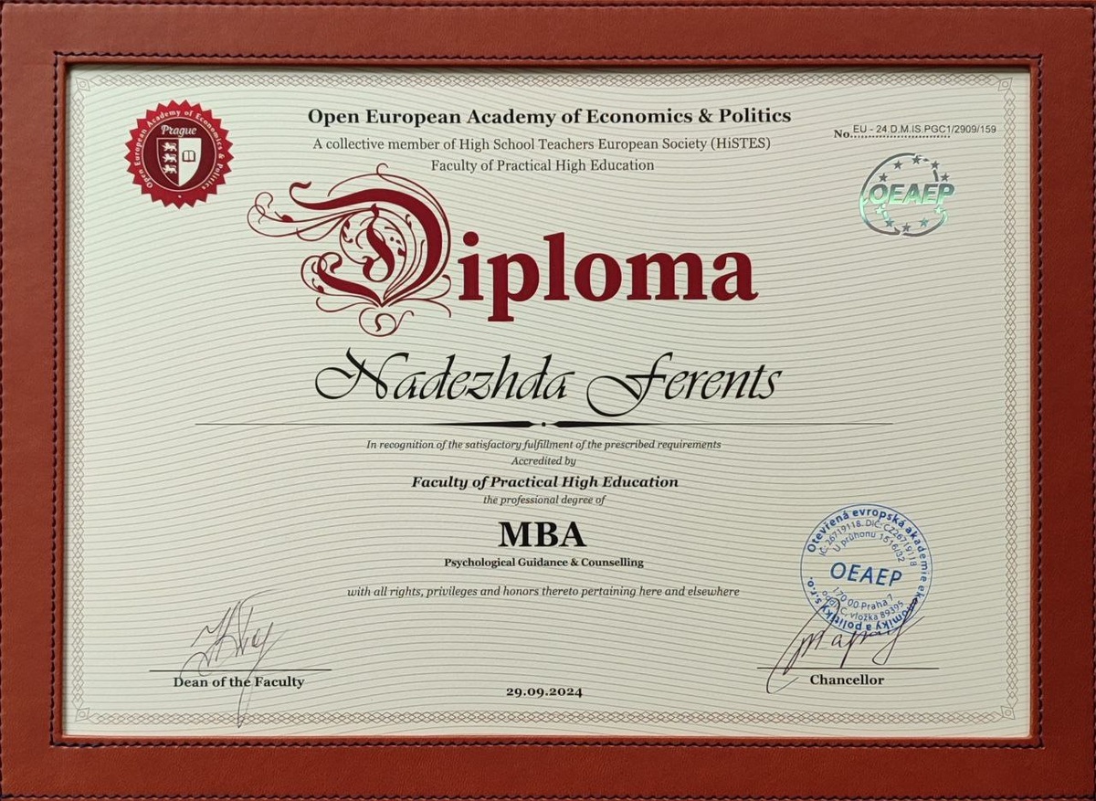 Больше полугода ожидания, но оно того стоило! 🎓 Мой диплом MBA наконец-то добрался до меня из Праги и он в моих в руках!🎉 Открытая Европейская академия экономики и политики. Прага. Европейская Ассоциация ВУЗов (HiSTES) Аккредитован. Факультет практического высшего образования профессиональная степень MBA. Психологическое руководство и консультирование. Со всеми правами, привилегиями и наградами, относящимися к ним и в других местах. 29.09.2024 Чувство, когда мечты материализуются, – 🔠🔠🔠🔠🔠🔠🔠🔠. Гордость, радость, удовлетворение… и желание двигаться дальше! Этот диплом – не просто документ, а символ роста, развития и моей веры в то, что учиться нужно всегда. В психологии – особенно! Впереди новые горизонты, новые знания и еще больше возможностей для того, чтобы поддерживать вас в сложные периоды в жизни, помогать вам становиться счастливее и увереннее в себе. Спасибо всем, кто и меня поддерживает на этом пути ❤️ (c) ваша Энэф 🕊 #обо_мне