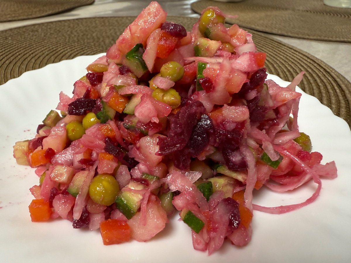 Добро пожаловать на мою кулинарную страничку! Винегрет - одна из самых популярных закусок. Классический винегрет готовят с квашеной капустой и солеными огурцами, но это блюдо, по моему мнению, зимнее. Предлагаю вам не менее вкусный салат в летнем варианте, который станет спасительным блюдом в жаркий день не хуже окрошки. При этом приготовление не займёт много времени. В качестве заправки возьмите любое растительное масло по вкусу. У меня было ароматное подсолнечное. Ингредиенты: ********************************************************************************** Приготовление блюда: 1. Вареную свеклу почистить и нарезать небольшими кубиками. 2. Вареную морковь нарубить мелким кубиком. 3. Вареный картофель так же нарезать небольшими кубиками. 4. Нарезать свежие огурцы. 5. С консервированного горошка слить всю жидкость и добавить его к остальным овощам. 6. Добавить к винегрету квашенную капусту. 7. Мелко порубить репчатый лук. 8. Добавить к овощам соль по вкусу, заправить растительным мас