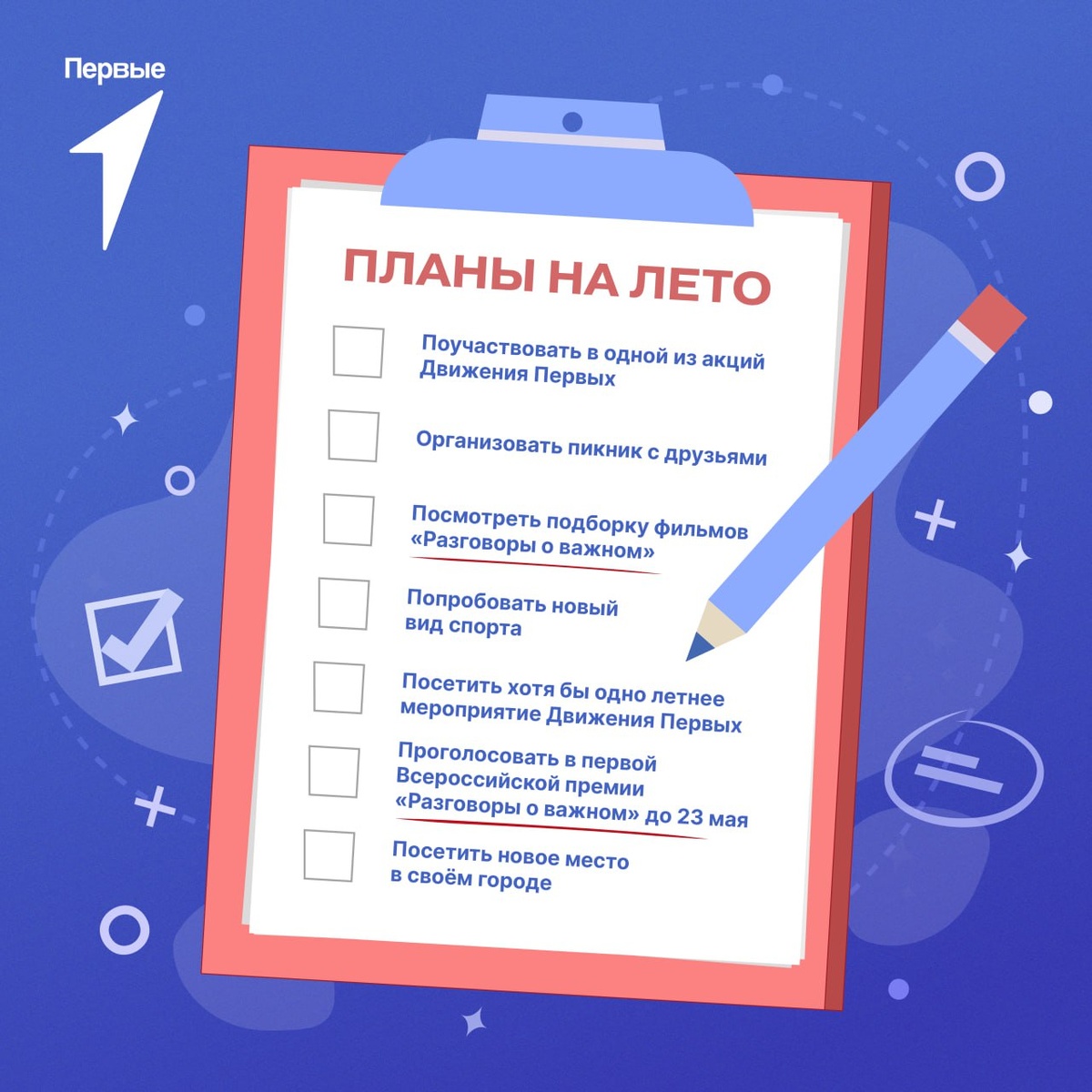 Если хочешь закрепить пройденный материал на занятиях и составить план на летние каникулы, Движение Первых подготовило для тебя чек-лист. Сохраняй его и отмечай галочками то, что собираешься сделать в ближайшее время!