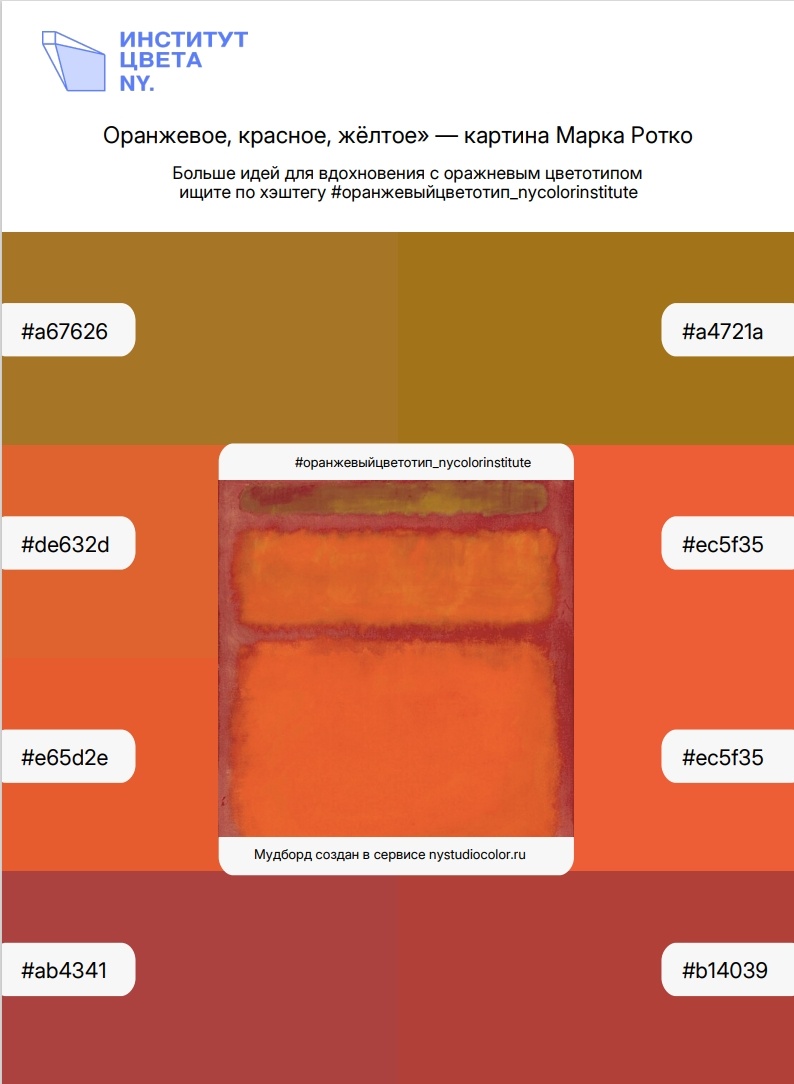 Самая дорогая картина русского художника купленная на аукционе Christie's, В 2012 году картина побила рекорд. За три прямоугольника с нечёткими очертаниями неизвестный коллекционер заплатил 86 882 500 долларов США — почти по 30 миллионов за каждый. Сейчас картина находится в частной коллекции. NY COLOR INSTITUTE проанализировал произведение Марка Ротко, цифровым инструментом и сделал вывод: данное живописное полотно принадлежит палитре оранжевого фильтра в модели по методу оттеночных фильтров.