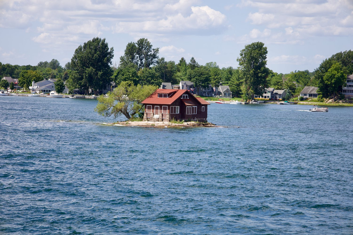 Представьте себе дом, построенный на обеденной тарелке – примерно так выглядит Just Room Enough Island, или “Остров, где едва хватает места”. Это крошечный островок, который местные жители в шутку называют “островом тёщи”. На всей его территории умещается лишь небольшой дом, одинокое дерево и пара садовых кресел, установленных на гранитной скале. Всё остальное – вода. В 1950-х годах семья Сайзленд решила найти уединённое место для летнего отдыха. Среди множества островков архипелага они выбрали крошечный Hub Island, который ничем не выделялся, кроме своей миниатюрности. Тогда это была просто гранитная платформа площадью 306 квадратных метров, возвышающаяся над водой. Сайзленды приобрели этот участок и начали строительство. На таком маленьком пространстве удалось разместить только один дом. Они расположили его так, чтобы он не выходил за пределы суши, установили садовую мебель и посадили дерево – это было необходимо по местным правилам, чтобы участок считался островом. Остров используе