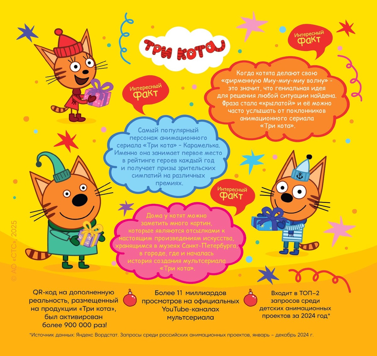 Мультсериал «Три Кота» вновь подтверждает свой статус лучшего по версии XII премии Ассоциации продюсеров кино и телевидения! 13 мая состоялась церемония вручения премии АПКиТ, где проект «Три Кота» шестой год подряд был признан лучшим анимационным сериалом! Награда стала очередным подтверждением того, что хит СТС Анимации популярен и любим среди юных зрителей и их родителей, а Коржик, Карамелька и Компот завоевали сердца миллионов детей. В 2025 году «Три Кота» отмечают свой юбилей – уже 10 лет сериал радует своих зрителей. Анна Тарада, директор департамента анимации «СТС Медиа»: «Хочу поблагодарить уважаемое жюри АПКиТ (Ассоциации продюсеров кино и телевидения) за доверие и столь высокую оценку нашего проекта. 2025 год для нас очень важный. Именно в этом году проект “Три Кота” отмечает юбилей – 10-летие. В этом году мы подготовили много сюрпризов для поклонников франшизы – это и новые песни, и новый сезон, а в конце года на экраны страны выйдет специальный выпуск. Приглашаем всех в кин